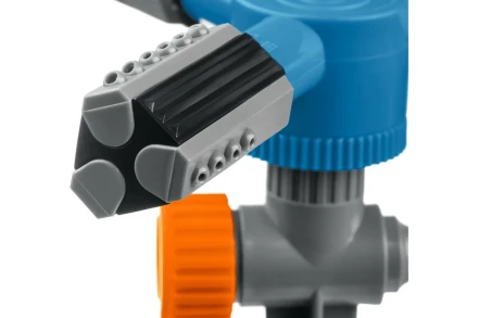 Изготовлен из ударопрочного пластика, что обеспечивает прочность и долговечность изделия. Три регулируемых сопла обеспечивают возможность установки различной интенсивности и площади полива. Два соединительных гнезда позволяют использовать изделие в цепочке из нескольких распылителей.